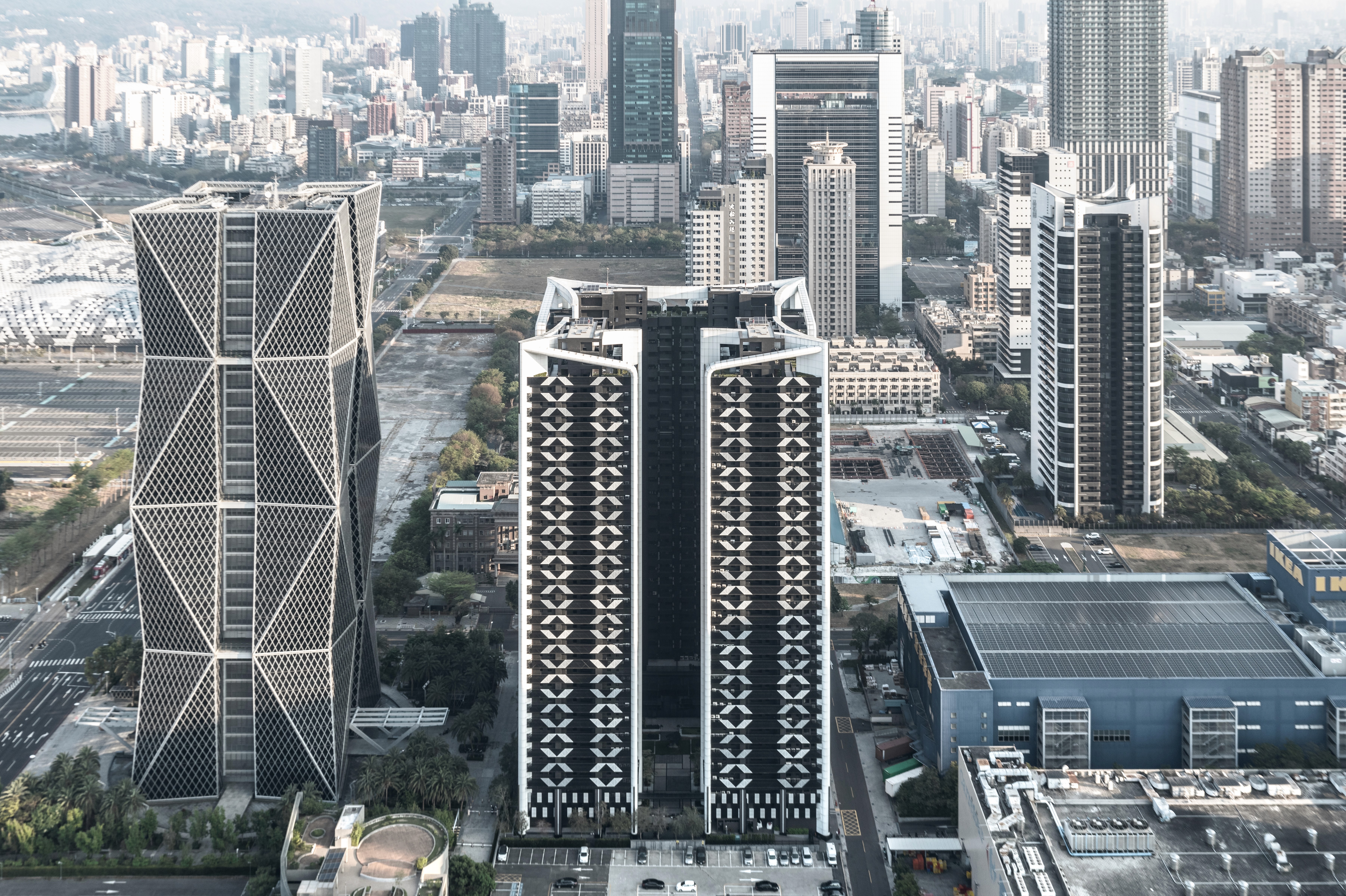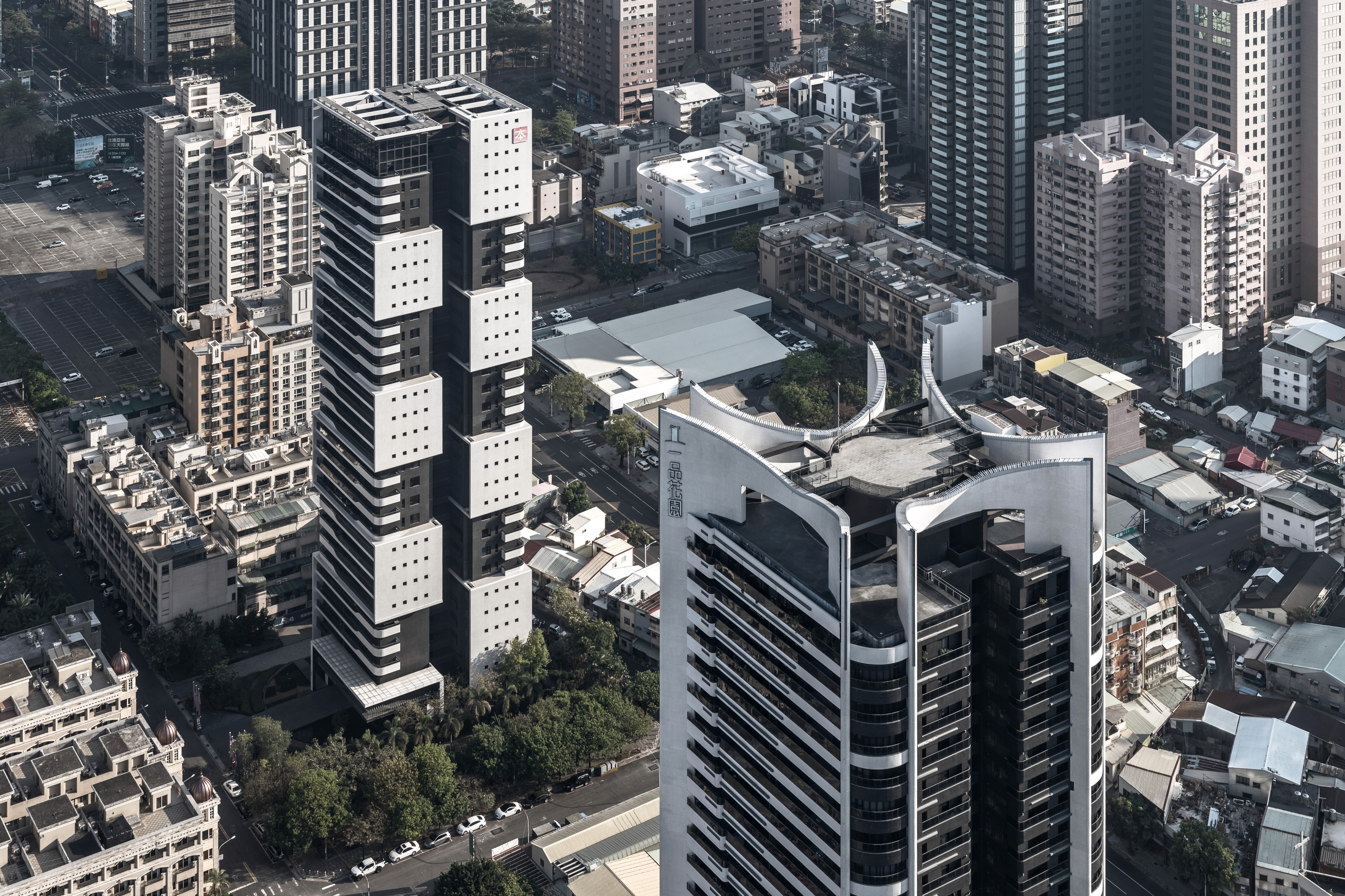 Harbor Times (2018) The design team responded to the nearby China Steel Headquarters by using white geometric frameworks and rational collages of light and dark aluminum panels to create a rich facade expression. We seek variations within the orderliness of the volume's in-and-out surfaces, showcasing the dialogue between the stability of corporate architecture and the lightness of contemporary residential design.