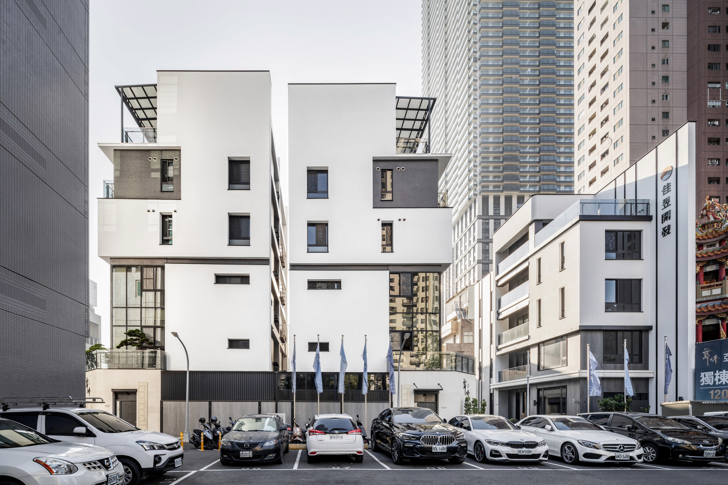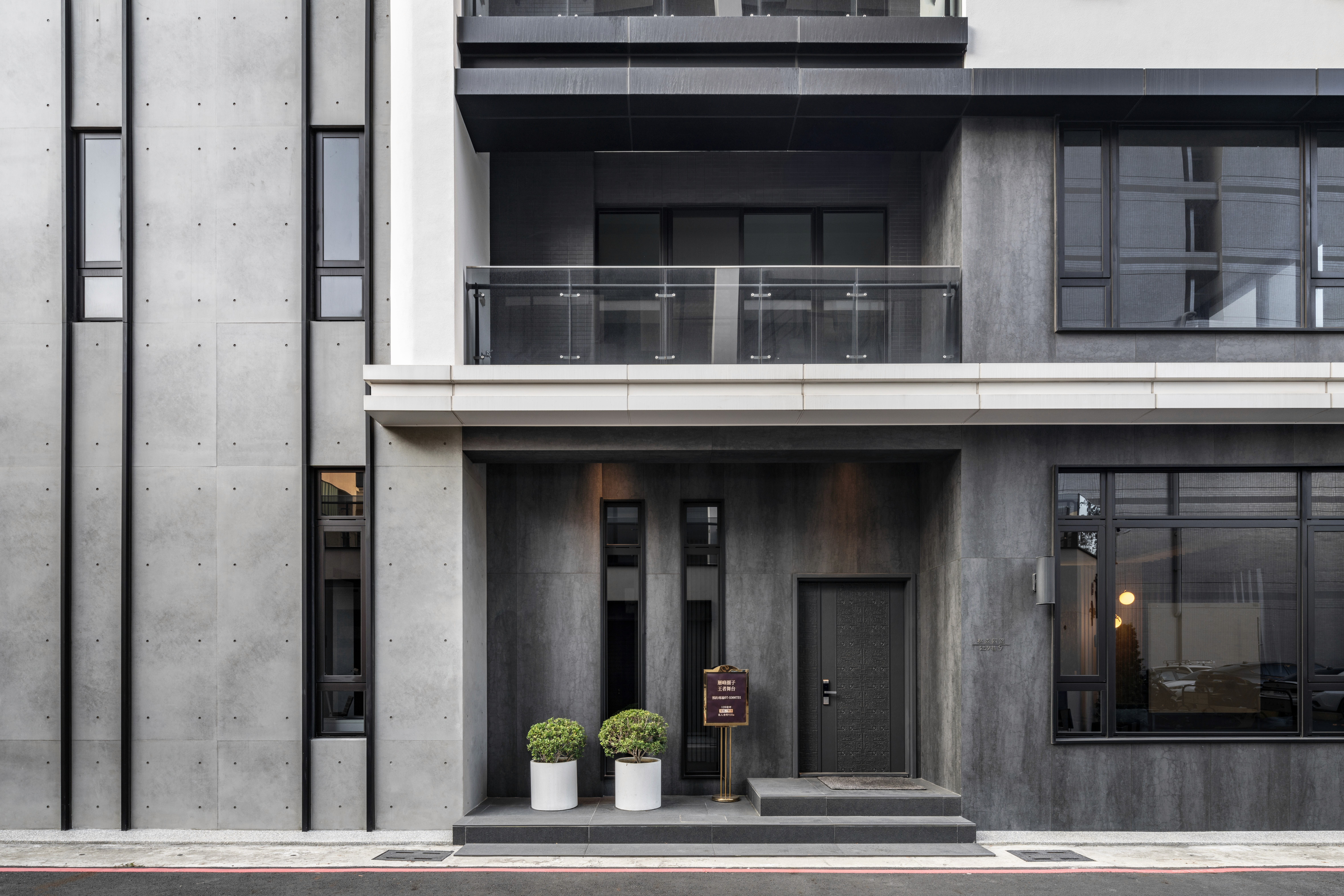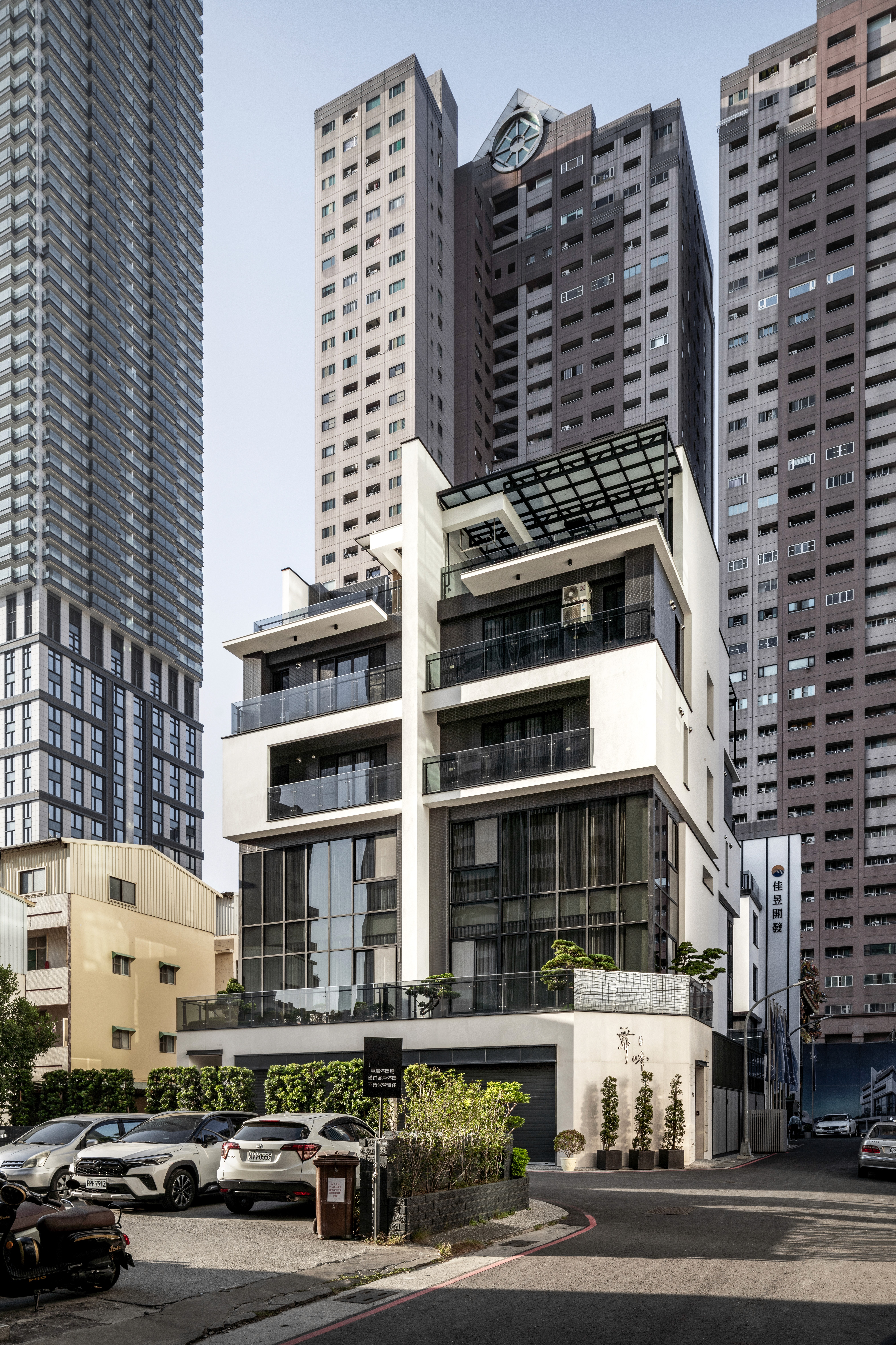 本案位於高雄亞洲新灣區的核心位置,主要由獨棟及雙併別墅組成。其具備獨立街廓,容易成為巷弄間的焦點,為了使建築在整個街區中脫穎而出,外觀上以黑色丁掛為基底,利用白色薄板及塗料等較新穎之材料分割出框架形式,同時透過大面落地窗簡化整體量感,在造型地同時也將室內與戶外景觀互相融合。
